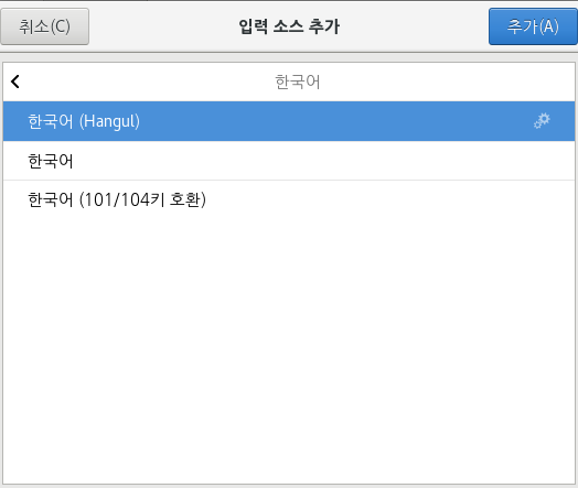 위처럼 3종의 한국어가 표시되는데 이 중에서 "한국어 (Hangul)" 항목을 선택하여 추가