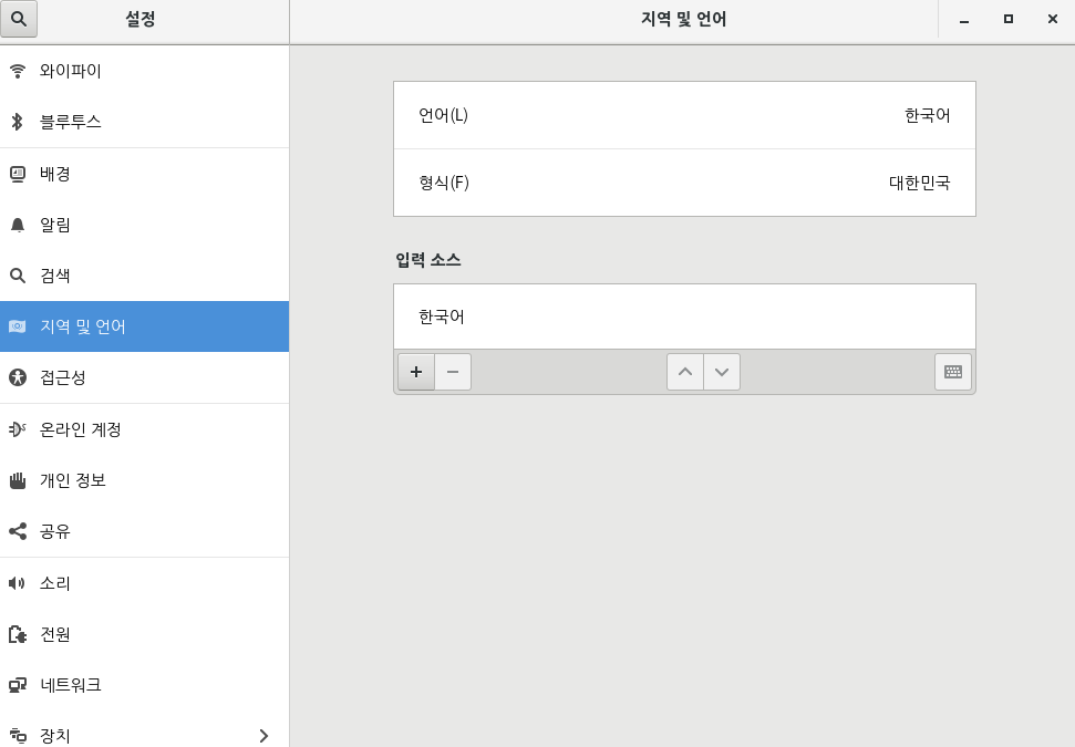 위처럼 입력 소스란에 "한국어"만 추가된 환경일 경우 터미널 등에서 한글 입력이 안 됨