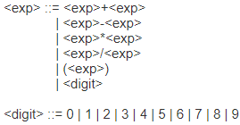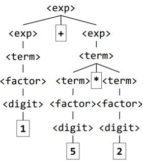 | <exp> → <exp>+<exp> → <exp>+<exp>*<exp> → <exp>+<exp>*<digit> → <exp>+<exp>*2 → <exp>+<digit>*2 → <exp>+5*2 → <digit>+5*2 → 1+5*2 |