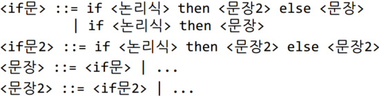 ![]() else문 앞에 나온 if문들 중 다른 else문과 짝이 되지 않은 가장 가까운 if문과 짝이 되도록 함 |