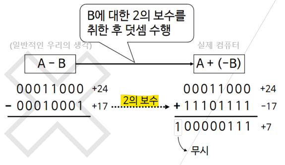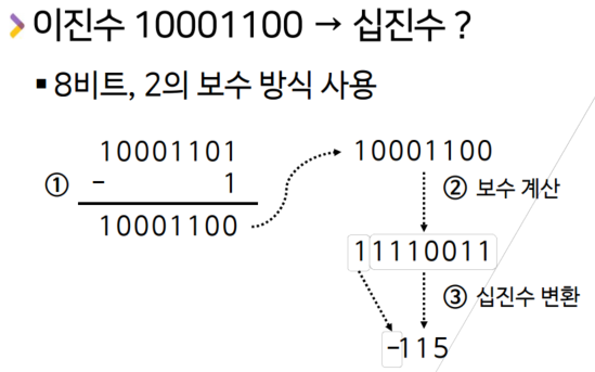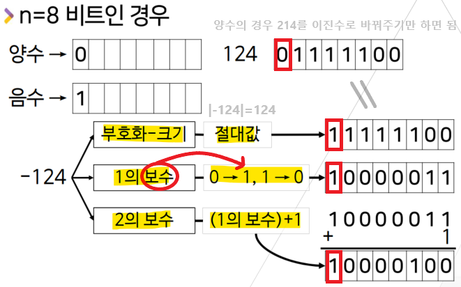 - 부호 있는 정수: 최상위 비트 => 부호 비트(0: 양수, 1: 음수)
