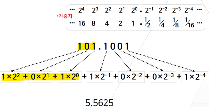 10진수 = (각 비트값 * 해당 비트 위치의 가중치) 의 합