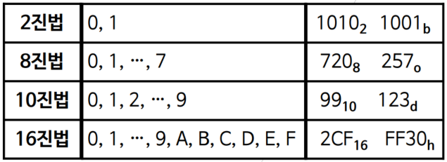 - r진수: 0, 1, ..., (r-1)까지의 숫자만을 사용해서 표현한 수