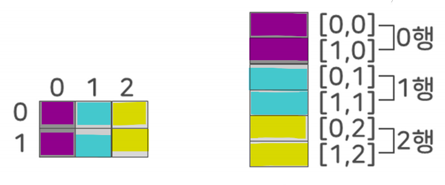 - 첫 행에 있는 각 열의 원소를 차례대로 컴퓨터 메모리에 저장하고 다음 행으로 이동하여 각 열에 있는 원소부터 차례대로 컴퓨터 메모리에 저장하는 방법