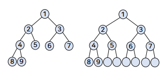 - 높이가 k인 이진 트리가 '0 레벨'부터 'k-2 레벨'까지 다 채우고, 마지막 'k-1 레벨'에서 왼쪽부터 오른쪽으로 노드들이 차례로 채워진 이진 트리