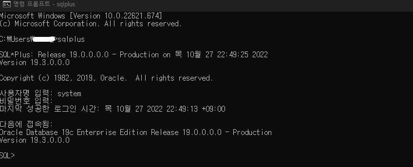 cmd 창에서 sqlplus로 오라클 접속되면 잘 설치된거임