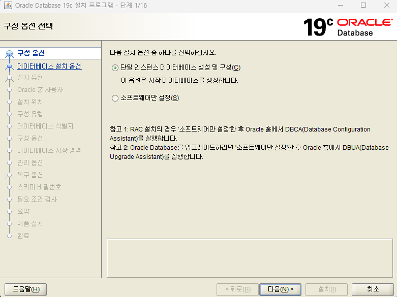 단일 인스턴스 데이터베이스 생성 및 구성 선택 후 [다음]