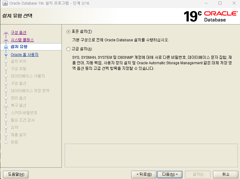 고급 설치를 통해 세밀한 설정을 할 수 있지만, 표준 설치로 진행해도 괜춘