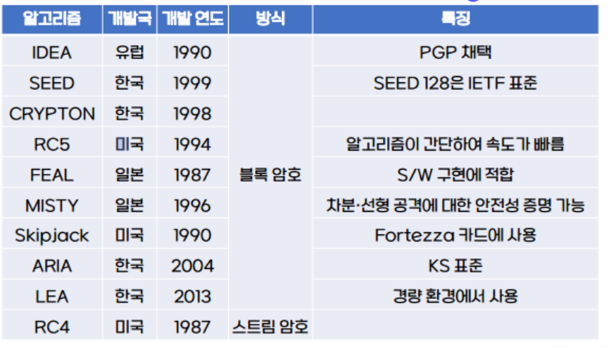 - 대표적인 알고리즘: DES, AES, IDEA 등