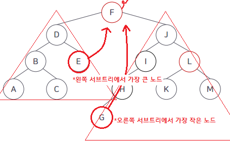 새로운 기준값(삭제된 자리에 올 키값)을 선택하여 해당 (잎)노드에서 삭제하고 그 값을 현재 키값을 삭제한 자리로 옮긴다. 즉 대체한 것이다.