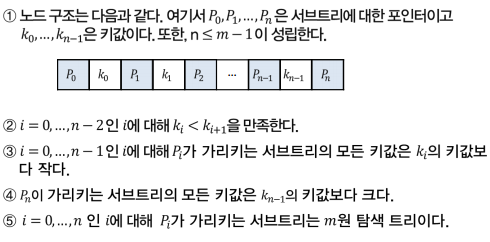 ① 공집합이거나 높이가 1 이상인 m원 탐색 트리이다 ② 루트 노드는 2개 이상 2 ⌊ (2m-2)/3 ⌋ + 1개 이하의 자식노드를 갖는다 ③ 내부노드는 최소한 ⌈ (2m-1)/3 ⌉개의 자식노드를 갖는다 ④ 모든 잎노드는 동일한 레벨에 놓인다 ⑤ 포인터가 k개인 잎이 아닌 노드는 k-1개의 키를 갖는다(루트노드 포함)