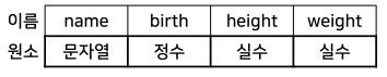 원소들의 구성 형태는 구조체와 유사함 → 각 원소는 이름으로 구별