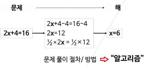 단계적인 조리 절차를 따르면 음식을 만들 수 있듯이, 주어진 문제도 단계적인 풀이 절차("알고리즘")를 따르면 문제의 해를 구할 수 있음