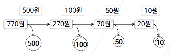 고객에게 돌려줄 거스름돈이 T만큼 있을 때 고객이 받을 동전의 개수를 최소로 하면서 거스름돈을 돌려주는 방법을 찾는 문제 동전의 종류 → 500원, 100원, 50원, 10원
