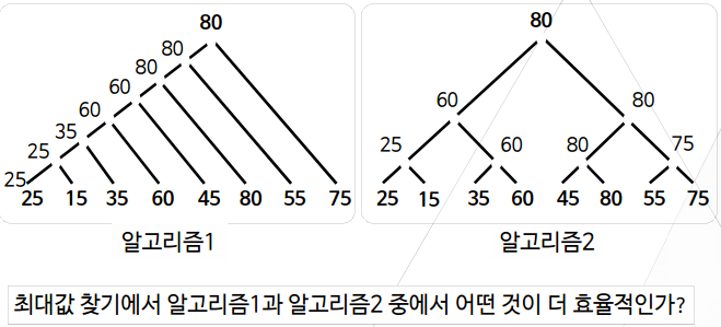 Q. 어떤 수의 최대/최소값을 찾기 위해 몇 번의 비교가 필요할까? A. n→(n-1) 두 개의 데이터 중 최대값을 찾으려면 1번 비교, 세개의 데이터 중 최대값을 찾으려면 2번 비교...