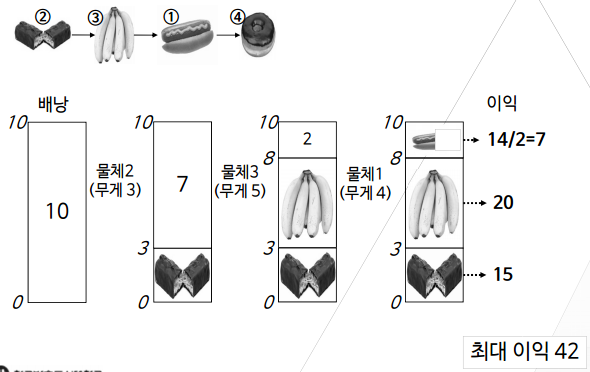 배낭의 용량을 초과하지 않는 범위에서 배낭에 들어 있는 물체의 이익의 합이 최대가 되도록 배낭에 물체를 넣는 방법을 찾는 문제