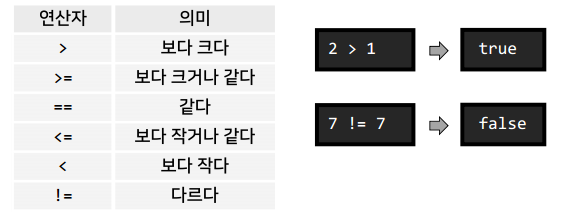 관계 연산: <, >, <=, >=, == != 등 → 연산의 결과 값은 논리형
